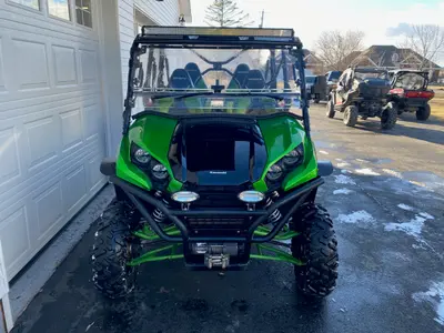 Only 1,600 miles! Financing available, Power Steering, Full roof, windshield with wiper, full doors, built-in molded rear window, side mirror, 1/2 doors, fender flairs, Fox Gas Shocks, winch w/ remote, LED bumper lights, LED dual headlights, blacked out mag wheels with Maxxis Bighorn tires, LED roof light, Real nice bike!